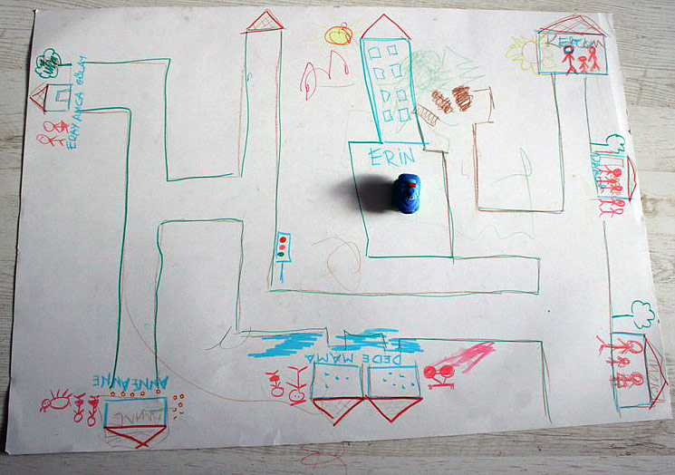 Anneannenin evinde kimler var ?? Tete var anneanne var Reçel var.. reçel ne yapıyor??havhav yapıyor?? Köpeğin adı neydi “Tel” gibi diyaloglar ile bütün evleri doldurduk. Sonra trafik ışıkları koyduk arabayoluna..kırmızıda “dur” turuncuda ” bekle” yeşilde” geç” öğrendi Erin.. ağaçlar çizdik.. ve sonra oynamaya başladık.