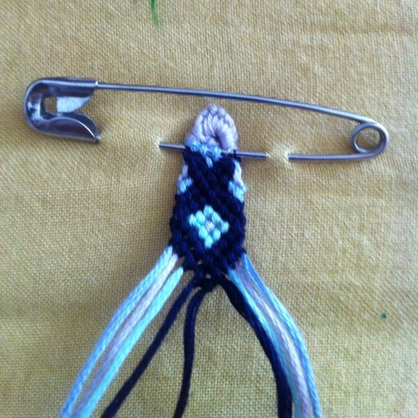 Ben iplerimi bağladıktan sonra bir çengelli iğne yardımı ile üzerimdeki kıyafete ( pantolon ) ya da bir yastığa aşağıdaki gibi takıyorum böylece ip kaymıyor ve bilezik örme aşamasında sabit kalıyor. Düz ve başlangıç seviyesi bilezik için 60cm ip kesmek yeterli. İlk bilezik için 5 ya da 6 tane ayrı renk seçerseniz iplerin sırasını karıştırmazsınız.