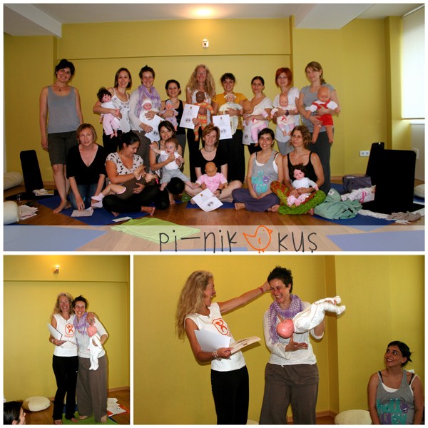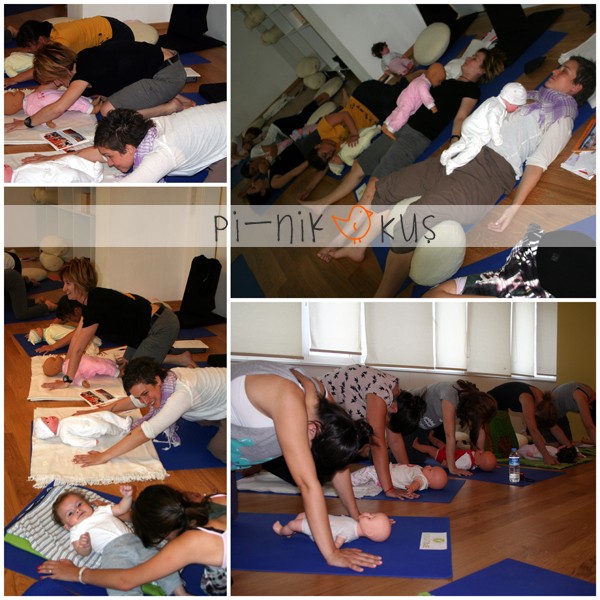 Evde elbette yaptırmak çok zor değil tıpkı benim yaptığım gibi bir kitaba bakarak ya da tıpkı annelerimizin bildikleri gibi bebeklere hareket yaptırabiliriz ancak küçük bir bebekle saatlerce eve kapanmak ve dünyada bir tek ben anne oldum ve bu çok zor psikolojisinden çıkmak, kendine benzer türler ile bir araya gelmek ve bebek bakımından, emzirmekten daha başka bir şeye konsantre olmak.. bence bunun adına anne – bebek yogası deniliyor! Hareketleri yapmayabilirsin, bebeğini kucağına alıp dans da edebilirsin istersen bebeğini yere bırakıp sadece kendin için hareketler yapıp saatlerde emzirmekten ağrıyan sırtını rahatlatabilir doğumdan sonra zayıflayan karın kaslarının azıcık da olsa toparlanmasına yardımcı olabilir en önemlisi SOSYALLEŞEBİLİRSİN! Bunun ne kadar zor olduğunu çok iyi hatırlıyorum bu sebeple doğmuştu BENİMLE OYNAR MISIN ANNE. Sonuç olarak fikren uzak olduğum bir konu değil ya rahattım işte.. amacımı biliyordum. Bir başka amacım da yenidoğan bebekler ile çalıştığım için annelerin bana güvenebilmeleri için bir sertifikasyondu. Şimdi daha güvenle annelere bebeklerini nasıl rahatlatabileceklerini, nasıl tutarsa daha keyifli olabileceğini ya da kendine nasıl benim bileğime verdiğim zarar gibi zarar vermeyeceğini en önemlisi rahatlamanın bebeği ne kadar rahatlattığını anlatabileceğim.. wowww.. birilerini rahatlatabilmek fikrinin ne kadar büyük bir duygu olduğunu karnımın içinde hissediyorum sanki 🙂 Çünkü ben yeni anneyken böyle değildi.. sanki her şey tek benim başıma geliyordu..spor yapmak istiyordum ama ne seviyede ne yapacağımı kestiremiyordum v.s v.s…