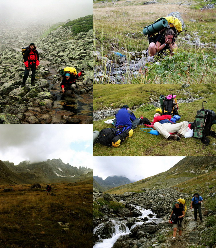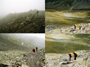 Sabah yola çıktığımız gölden sonraki ilk tepe sislerin içinde oldukça ürkütücü görünüyordu. Özellikle benim için fazlaca korkutucu ; o kadar ki ilk defa ağladım!! Yani bir iki damla yaş aslında ve inerken dizlerim titriyordu ama bu da aslında birkaç adım sürdü. Beni korkutan yine aslında benden başkası değildi. Bir gün önce o tepeyi sislerden kaybolmuş bir şekilde görüp gece boyunca tepemizdeki şimşekler ile uyumaya çalışırken öyle gözümde büyükmüşüm ki.. oysa oldukça normal bir iniş.
