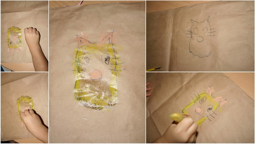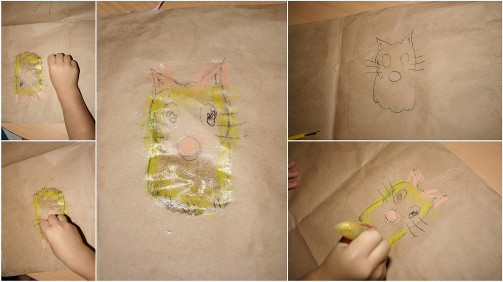 Kediyi yaparken elimizi iki defa kullanıyoruz. Önce bacaklarını yapmak için bir yumruk daha sonra şablonu çıkan bacakların üzerine 3 parmaklı ikinci bir yumruk. Çizdikten sonra ters çevirip kedinin kulaklarını burnunu ve bıyıklarını ekliyoruz.