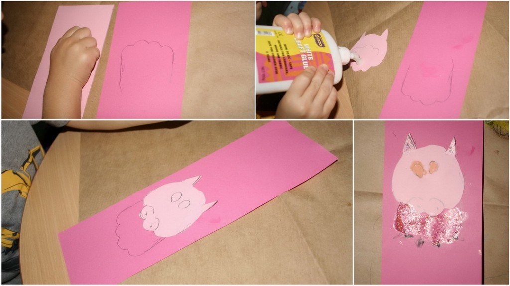 Domuz yapmak için aynı kedide uyguladığımız yöntem ancak bu sefer burnunu yaparken 3 değil 4 parmakla yumruk yapıyoruz. Renkli kağıtlara da yapılabilir düz kağıda yapılarak da boyanabilir.. size kalmış. Domuzda değişiklik olsun diye pembe kağıtlar kullandık.