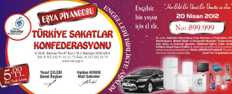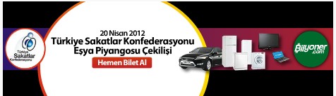 Türkiye Sakatlar Konfederasyonu, bir eşya piyangosu düzenliyor. Bilyoner.com ise bu piyangonun bilet satışını gerçekleştiriyor. 20 Nisan tarihinde sonuçlanacak olan çekiliş için siz de bir bilet alabilir ve engelleri onlarla birlikte aşabilirsiniz, çünkü bilet bedeli 5 TL olarak belirlenen piyangonun tüm geliri Türkiye Sakatlar Konfederasyonu’na aktarılacak.