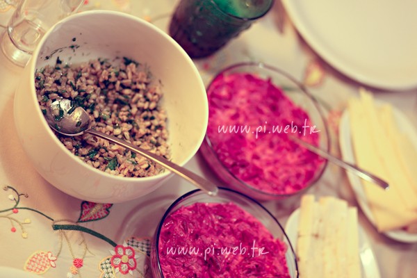 Tabii hep tatlıdan ibaret değildi her ne kadar günün tamamı tatlı da olsa. Sofrada benim iki favorimden biri bu tatlı diğeri ise buğday salatasıydı. Ben yaptım diye değil ama çok lezzetli hatta çocukların da yeme ihtmali yüksek, besleyiciliği de tabii. Buğdayı bir gece önce suda bırakıp ertesi gün hafif haşlıyorum. Sonra içine frenk soğanı, dereotu, rokayı ince doğrayıp, limon, zeytinyağı ve azıcık nar ekşisi ile karıştırıyorum. Hem kolay hem de tadı damağımda kalacak kadar lezzetli, her gün yapabilirim!!