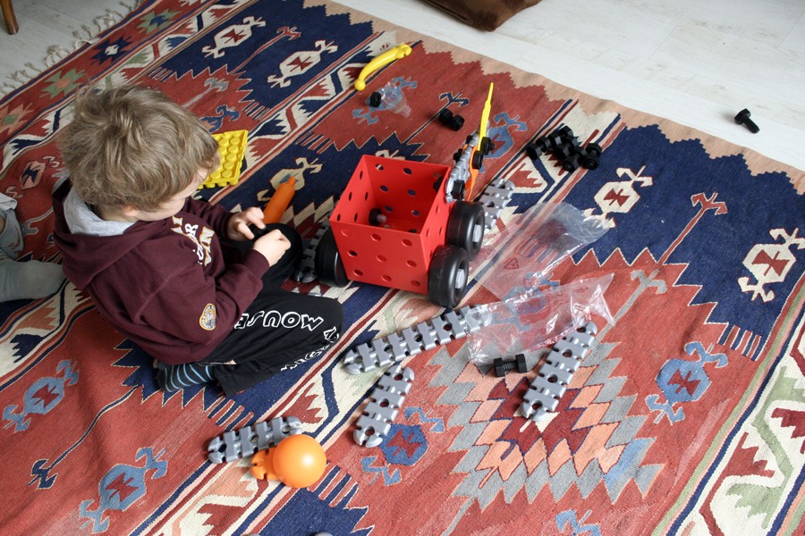 Erin’e çok sevdiğim bir arkadaşımdan Erin 2 yaş civarındayken gelen bir oyuncak elimizdeki. Anne olmayan biri için üzerinde “18 ay ve üzeri çocuklar için” yazması 2 yaşındaki bir çocuğa almak için gayet geçerli bir sebep. Bir çok takmalı, çıkartmalı, sökmeli, vidalamalı parçası var +70 parça diyor anlayın işte. Üstünde de uygun dediği yaşlarda bir çocuk, hazır yapılmış olanına bir parça ekliyor.
