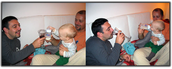 Kadeh tokuşturma aslında mizansen fakat bu kareleri çekmeden 5 dakika önce gerçekten Erin biberonu kaldırmıştı Mehmet de ona kadehini vuruyordu öyle Alpayın eli desteği falan yoktu hoşumuza gidince biz tekrarlattık 🙂 bizimde hoşumuza gitti yani kısacası 😛
