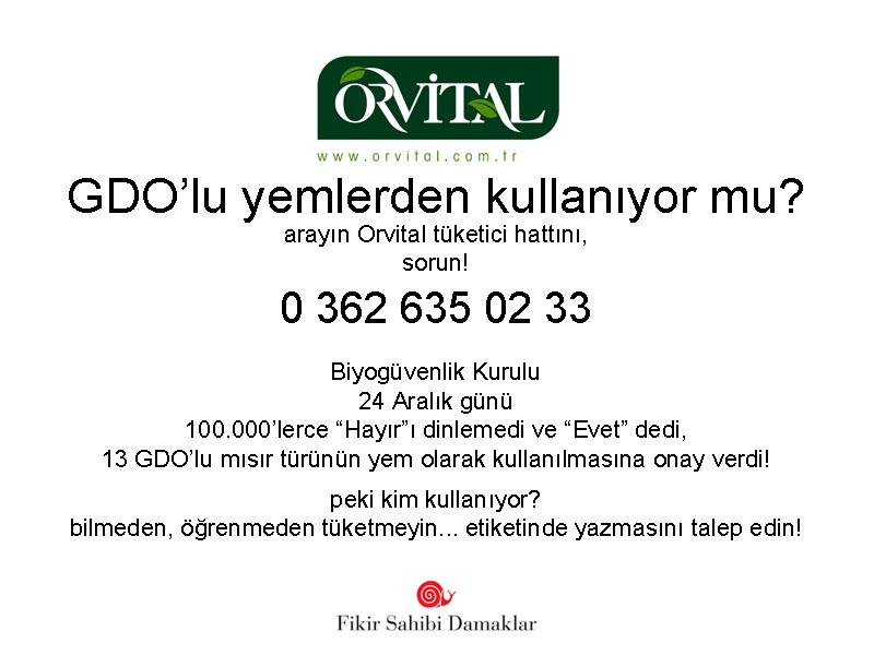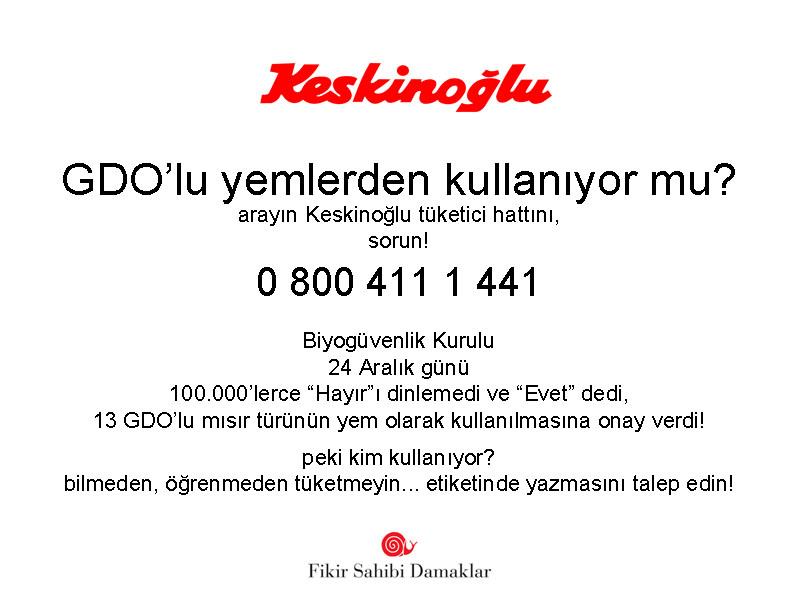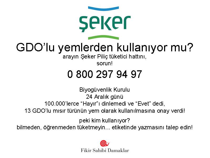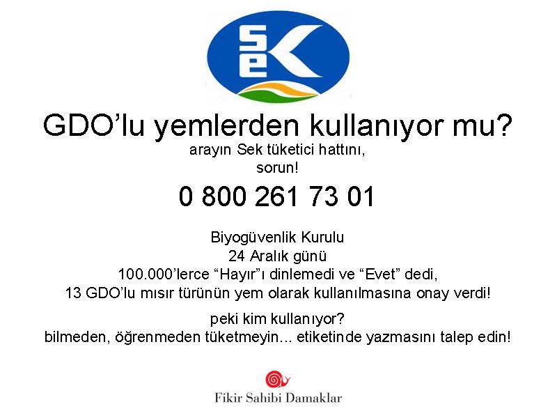 Türkiye Yem Sanayicileri Birliği Derneği İktisadi İşletmesi, Beyaz Et Sanayicileri ve Damızlıkçıları Birliği Derneği İktisadi İşletmesi (BESD-BİR) ve Yumurta Üreticileri Merkez Birliği’nin (YUM-BİR) yemlerde kullanım amacıyla başvurdular ve 24 Aralık günü Biyogüvenlik Kurulu 13 mısır çeşidine, yani Bt11, DAS1507, DAS59122, DAS1507xNK603, NK603, NK603xMON810, GA21, MON89034, MON89034xNK603, Bt11xGA21, 59122x1507xNK603, 1507×59122 ve MON88017xMON810’a onay verdi. Bu yemleri kullananlar etiketine yazmayacaklar ürettikleri ne tavuğun ne yumurtanın ve ne de etin.. siz oysa, bilmek istersiniz, değil mi? biz de bir seri kartpostal hazırladık size, süpermarketlerde en çok yer alan tavuk ve yumurta üreticilerinin tüketici hattı numaralarını paylaşmanız ve telefon açıp sormanız ve onlar da sorsun diye dost ve akrabalarınızla paylaşın diye… bilmemek, büyük zarar doğurabilir ileride. bilmiyordum demeyin. sorun. GDO’lu yemlerden kullanıyor mu, alıştığınız, güvendiğiniz markanız? sorun. seçiminizi bilmeden değil, bilinçli yapın.