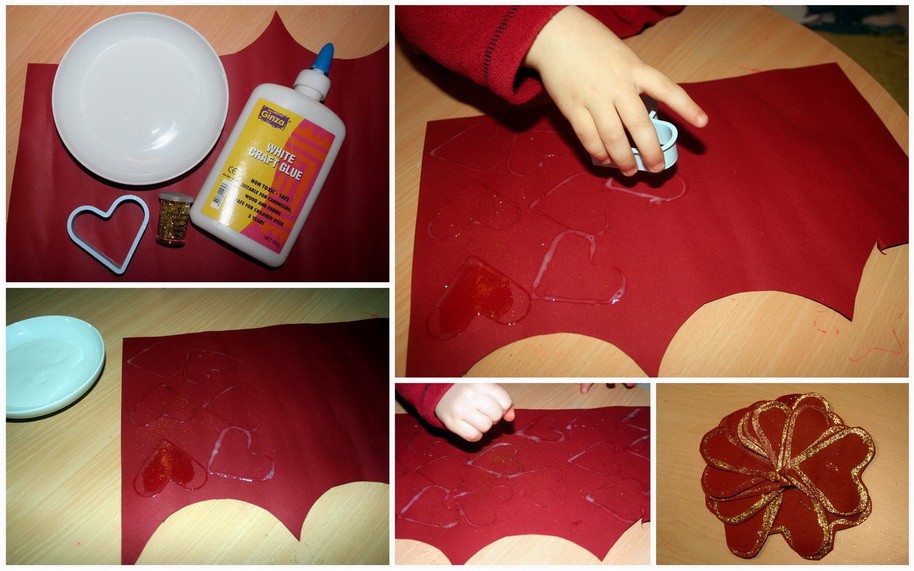 Biz seçtiğimiz bir tanesini yaptık ama daha şekillecek. Başka bir aktivitede kullanmak üzere saklıyoruz. Bira tutkal,bir kurabiye kalıbı tercihen kalp, sim,karton ya da atık kartonlar daha iyi. Kalıbı önce tutkalasonra kağıda basıyorsunuz. Tüm basma işlemi bittiğinde, simleri kartonun üstüne döküp biraz silkelediğinizde tutkallı yerlere yapışıyor gerisi dökülüyor. Sonra kurutup kalpleri kestik. Bakalım nerede kullanılacaklar.n Aklımdaki şu –>