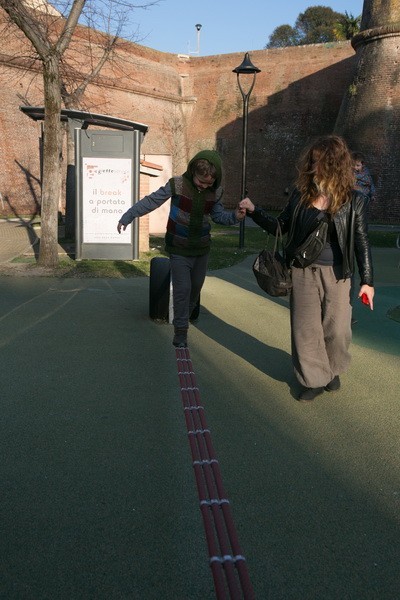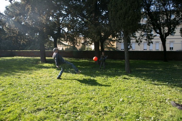 Yemekler ve tatlıdan sonra Grosseto’da turumuz devam etti. Önce meydanda biraz top oynadıktan sonra yeşillik bir yerlere gitmenin iyi olacağına karar verdik. Şehrin etrafı surlarla kaplı ve bu duvarların üzerinde yürünebiliyor. Aynı zamanda küçük yeşil alanlar var surların üzerinde. “Toskana güneşinin altında” yatmadık demeyelim diye çimenlere yayıldık yine. Hava muhteşem, kelebekler baharı müjdeliyor ve gelip üzerimize konuyorlar. Alex ve Erin bol bol futbol oynuyor. Yine gün sakin geçiyor ve saatler sanki daha uzun! Surların üzerindeki yürüyüş bizi bir çocuk oyun parkına getiriyor. Tüm günün kurgusu Erin için! Parka oynuyoruz hep beraber, sonra dondurma! İstisnasız her öğün arasında dondurma!