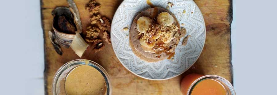 katların arasına ince bir tabaka şekersiz fıstık ezmesi, bal, dövülmüş ceviz badem en üstüne de biraz pekmez. Yanında da portakal greyfurt suyu