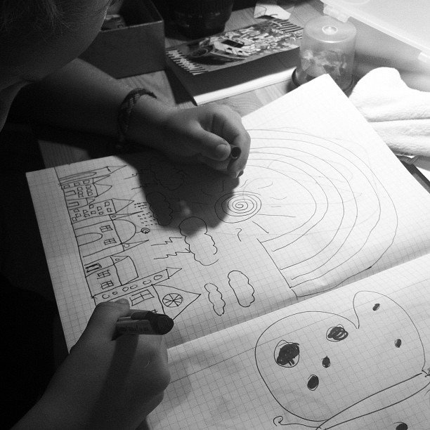 En son iki akşam önce yerde oturmuş bir kağıda kendimce çiziyordum. Koltukta uzanmış beni seyrederken ” boş oturmayım gelim senin resmine yardım edim” dedi. Benim yuvarlağı güneş yapmak istedi, kalemleri serdim yere. Yaptığı çizgilere yorum yapmadan kendim çizmeye devam ettim. Sonra “en iyisi kağıdın öbür köşesi de ay dede olsun” diyerek çizmeye devam etti.