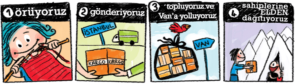 Size en yakın Doğa Koleji‘nin Rehberlik Servisine, paketin üzerine “Van İçin Örüyoruz” diye not ederek ördüklerinizi bırakabilir ya da kargo ile gönderebilirsiniz. Kargo konusunda henüz destekçi bir firma bulamadığımızdan gönderilerinizin ödemesini de sizin yapmanızı rica ediyoruz. Bu yüzden biraz biriktirip kargoya verirseniz daha güzel olur.